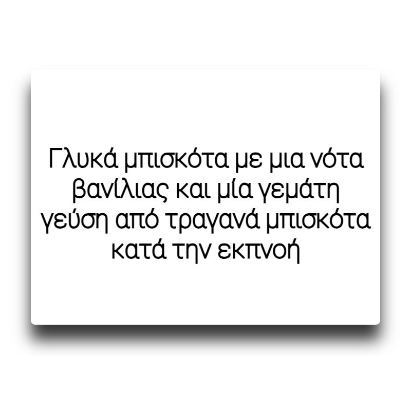 Ένα υγρό που θα σας εντυπωσιάσει από την πρώτη στιγμή! Γλυκά μπισκότα με μια νότα βανίλιας και μία γεμάτη γεύση από τραγανά μπισκότα κατά την εκπνοή. Ιδανική επιλογή για όσους προτιμούν τις απαλές γεύσεις. Ο συνδυασμός ζάχαρης και βανίλιας είναι ιδιαίτερα απαλό χωρίς να λιγώνει και θα γίνει η τέλεια συντροφιά σας για all-day vaping.
