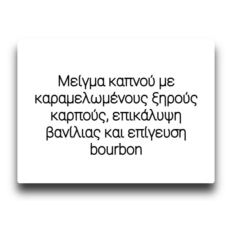 Μείγμα καπνού με καραμελωμένους ξηρούς καρπούς, επικάλυψη βανίλιας και επίγευση bourbon.