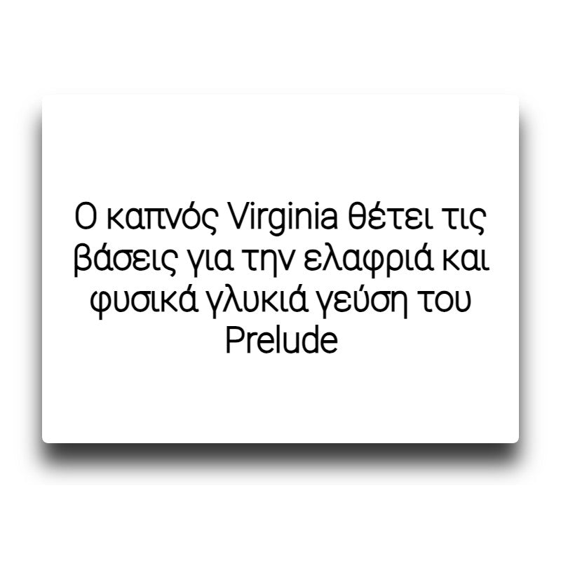 Ο καπνός Virginia θέτει τις βάσεις για την ελαφριά και φυσικά γλυκιά γεύση του Prelude. Τα φύλλα καπνού Βιρτζίνια, που καλλιεργούνται στις αμμώδεις πεδιάδες που περιβάλλουν τις ιταλικές Άλπεις, ωριμάζουν στην τελειότητα. Black Note Prelude Virginia Tobacco