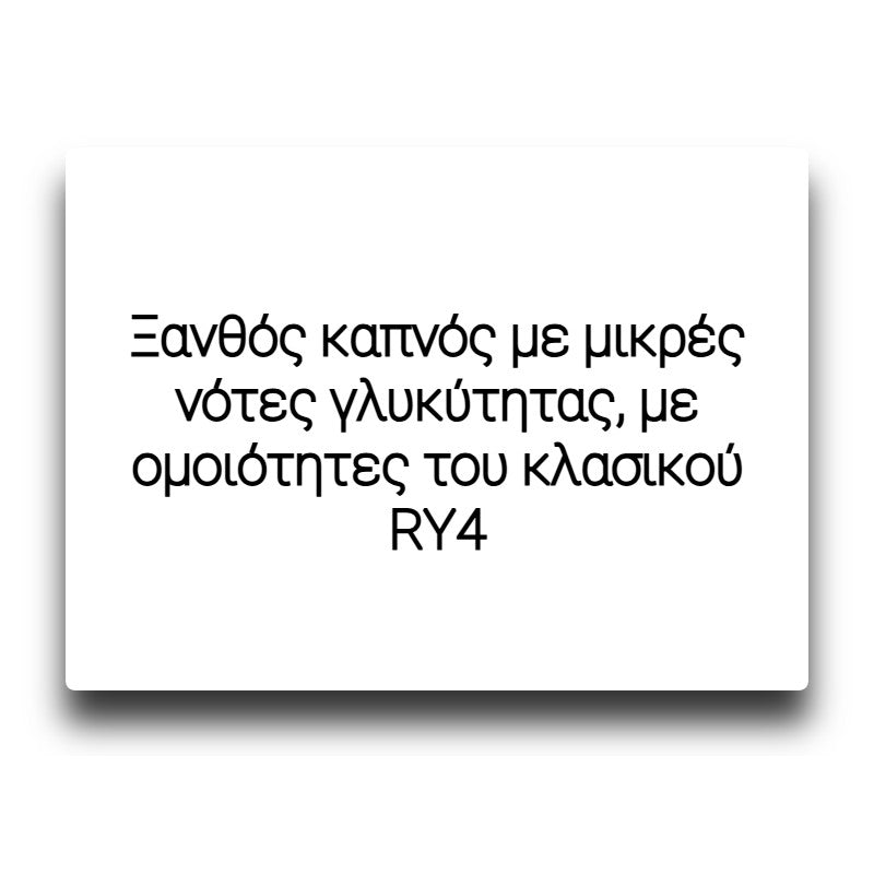 Ξανθός καπνός με μικρές νότες γλυκύτητας, με ομοιότητες του κλασικού RY4 και ευχάριστες νότες γλυκύτητας που το κάνουν μοναδικό στο είδος του.