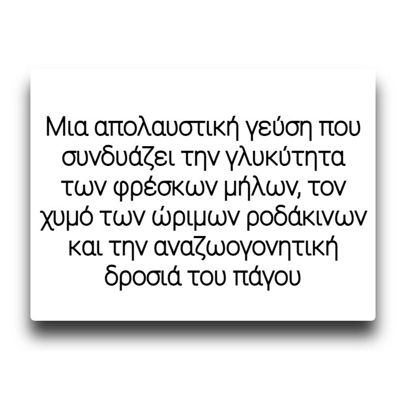 Μια απολαυστική και αρμονική γεύση που συνδυάζει την τραγανή γλυκύτητα των φρέσκων μήλων, τον χυμώδη χυμό των ώριμων ροδάκινων και την αναζωογονητική δροσιά του πάγου. Με κάθε εισπνοή, θα βιώσετε τη λαχταριστή συγχώνευση δύο αγαπημένων φρούτων, που το καθένα φέρνει στο προσκήνιο τα μοναδικά χαρακτηριστικά του.