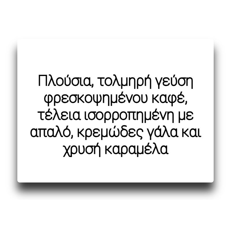 Απολαύστε την πλούσια, τολμηρή γεύση του φρεσκοψημένου καφέ, τέλεια ισορροπημένη με απαλό, κρεμώδες γάλα και χρυσή καραμέλα. Αυτό το απολαυστικό μείγμα προσφέρει μια ευχάριστη εμπειρία τύπου barista σε κάθε ρουφηξιά, με νότες από καβουρδισμένους κόκκους καφέ, βελούδινο αφρό και γλυκιά καραμέλα που μένει στον ουρανίσκο.