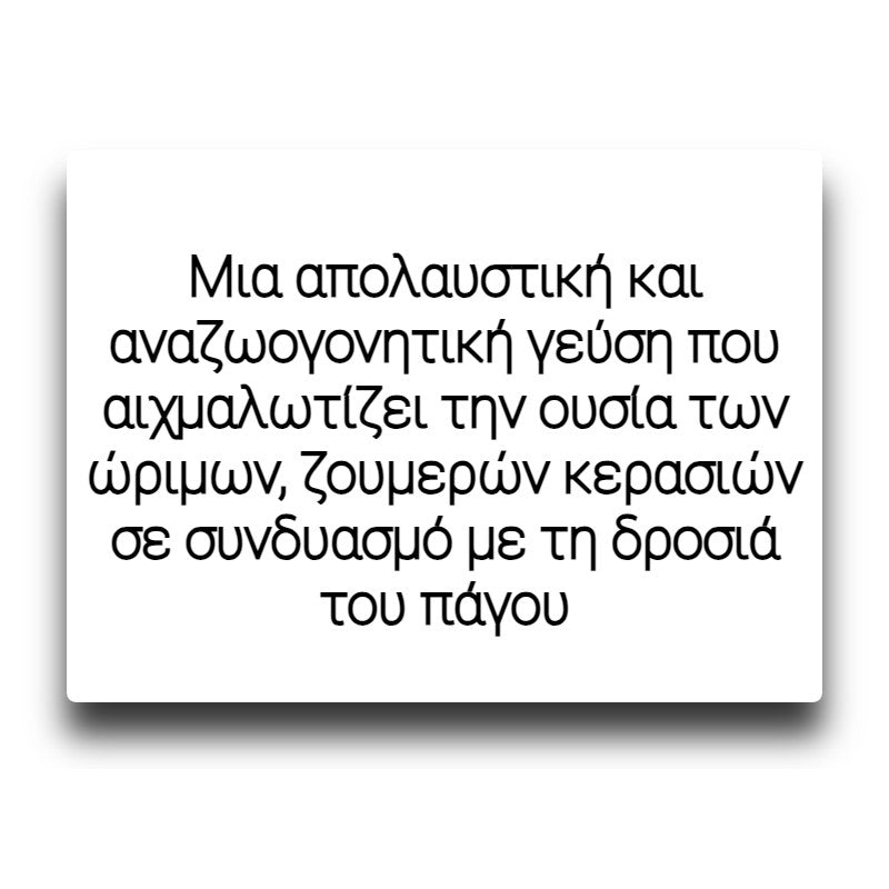 Μια απολαυστική και αναζωογονητική γεύση που αιχμαλωτίζει την ουσία των ώριμων, ζουμερών κερασιών σε συνδυασμό με τη δροσιά του πάγου. Με κάθε εισπνοή, θα νιώθετε την έντονη έκρηξη από γλυκές νότες κερασιού που χορεύουν στους γευστικούς σας κάλυκες, θυμίζοντας το δάγκωμα ενός ωριμασμένου από τον ήλιο κεράσι.