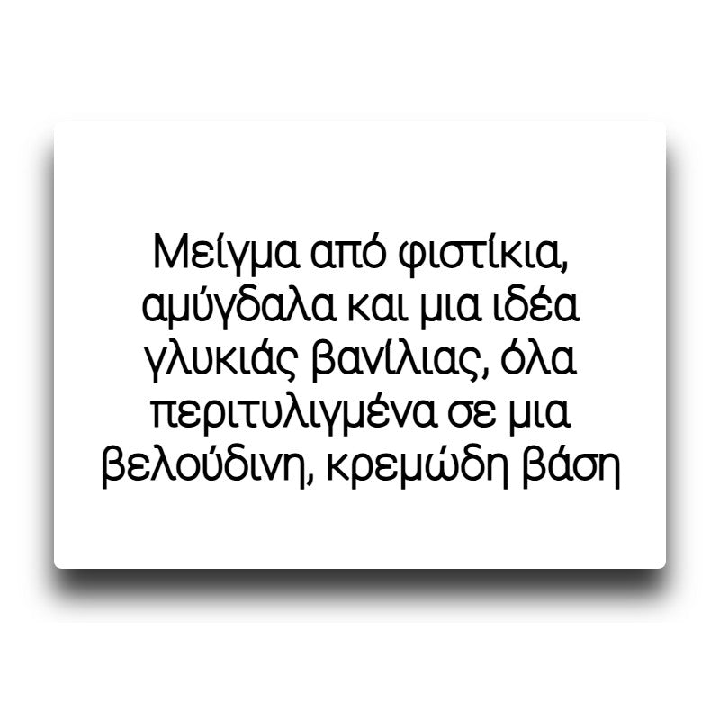 Απολαύστε την τέλεια αρμονία των πλούσιων, ψημένων ξηρών καρπών και της μεταξένιας κρέμας σε κάθε τζούρα. Αυτή η γεύση διαθέτει ένα μείγμα από φιστίκια, αμύγδαλα και μια ιδέα γλυκιάς βανίλιας, όλα περιτυλιγμένα σε μια βελούδινη, κρεμώδη βάση.