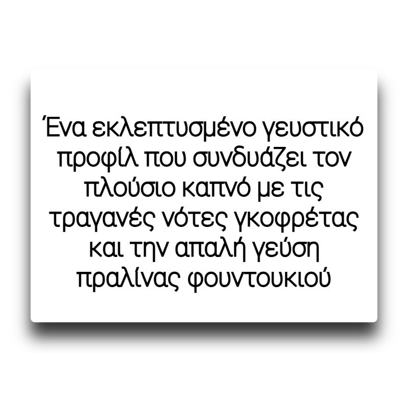 Ένα εκλεπτυσμένο γευστικό προφίλ που συνδυάζει τον πλούσιο καπνό με τις τραγανές νότες γκοφρέτας και την απαλή γεύση πραλίνας φουντουκιού. Ο γεμάτος και ελαφρώς ξηρός χαρακτήρας του καπνού ισορροπεί τέλεια με τη γλυκιά και βελούδινη πραλίνα και την πλούσια γεύση των φουντουκιών, προσφέροντας μια απολαυστική εμπειρία με βάθος και μοναδική γλυκύτητα.