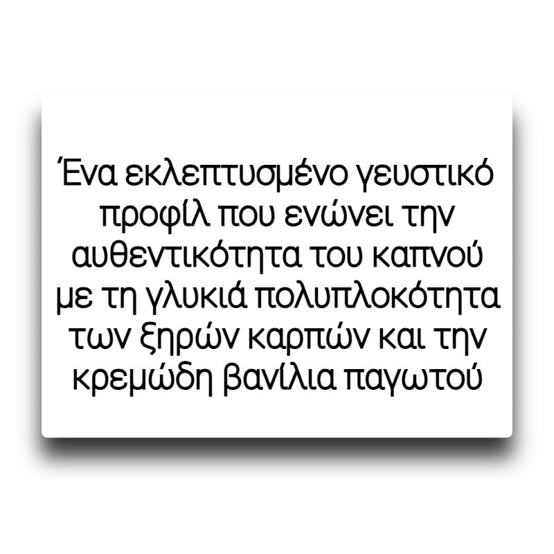 Ένα εκλεπτυσμένο γευστικό προφίλ που ενώνει την αυθεντικότητα του καπνού με τη γλυκιά πολυπλοκότητα των ξηρών καρπών και την κρεμώδη βανίλια παγωτού. Ο γεμάτος χαρακτήρας του καπνού λειτουργεί ως βάση, ενώ οι ξηροί καρποί προσθέτουν βάθος και τραγανή αίσθηση. Η βανίλια παγωτού ολοκληρώνει αρμονικά το μείγμα, προσφέροντας μια απαλή και απολαυστική εμπειρία με κάθε εισπνοή.