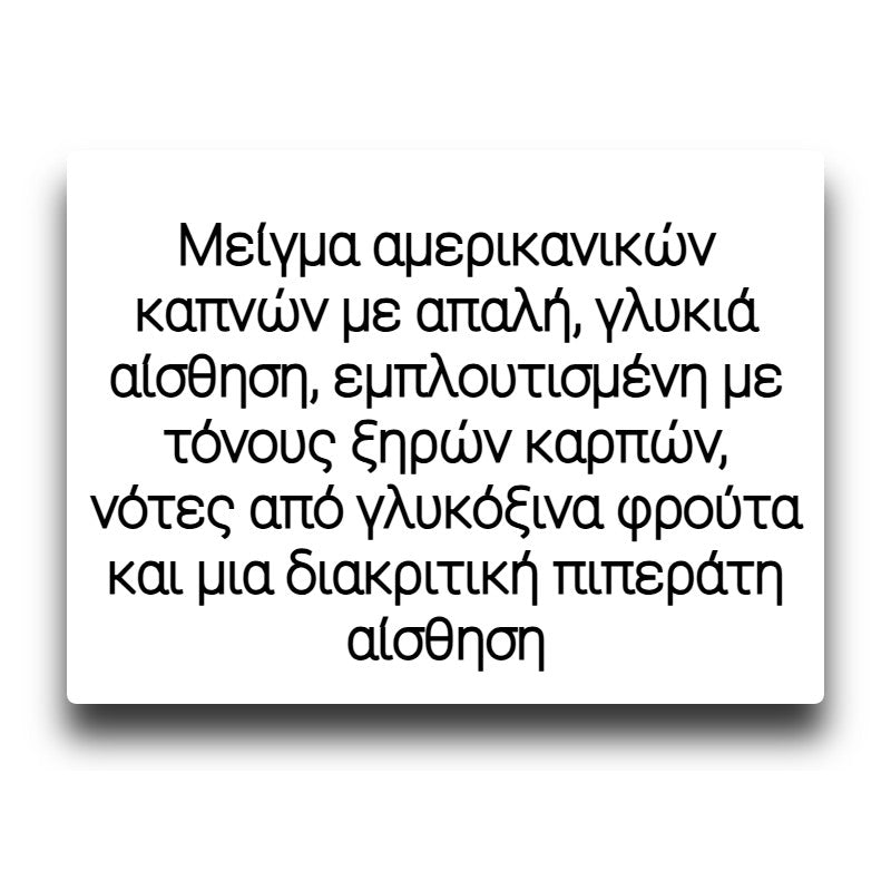 Ένα καπνικό μείγμα που προσφέρει μια απολαυστική αρμονία γεύσεων. Διακρίνεται για την πλούσια, γήινη έντασή του, με νότες από γλυκόξινα φρούτα και μια διακριτική πιπεράτη αίσθηση. Ένα μείγμα αμερικανικών καπνών προσδίδει μια απαλή, ελαφρώς γλυκιά αίσθηση, εμπλουτισμένη με τόνους ξηρών καρπών.