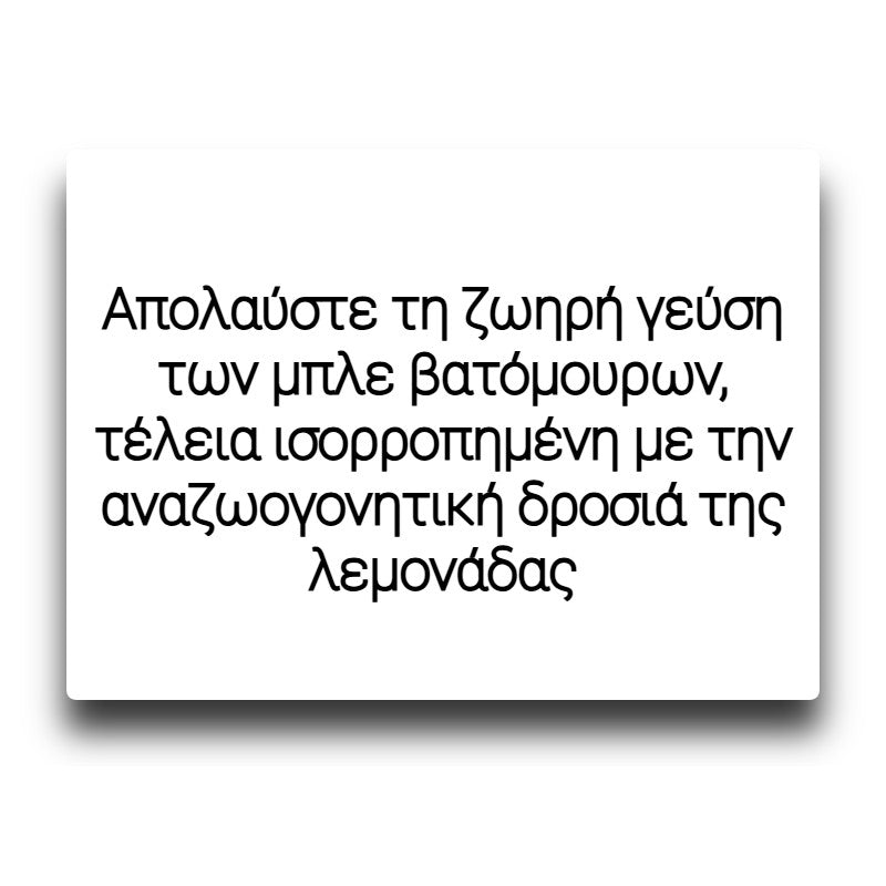 Απολαύστε τη ζωηρή γεύση των μπλε βατόμουρων, τέλεια ισορροπημένη με την αναζωογονητική δροσιά της λεμονάδας.