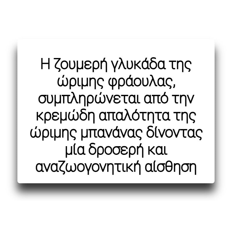 Η ζουμερή γλυκάδα της ώριμης φράουλας, συμπληρώνεται από την κρεμώδη απαλότητα της ώριμης μπανάνας δίνοντας μία δροσερή και αναζωογονητική αίσθηση.