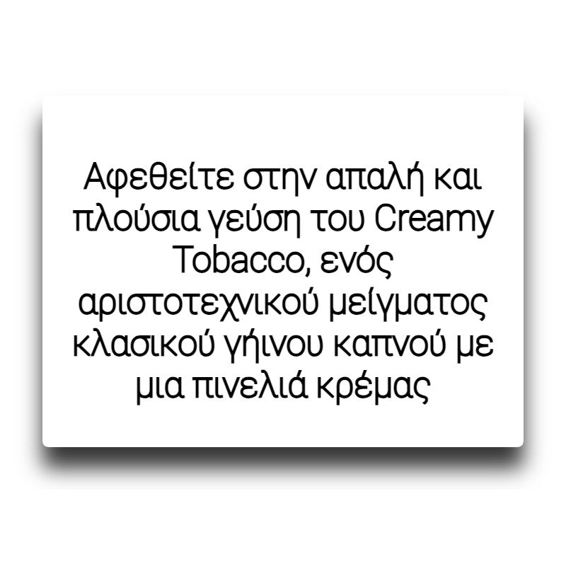 Αφεθείτε στην απαλή και πλούσια γεύση του Creamy Tobacco, ενός αριστοτεχνικού μείγματος κλασικού γήινου καπνού με μια πινελιά κρέμας. Μια ιδανική επιλογή για τους γνώστες του καπνού που λαχταρούν μια νότα γλυκύτητας.
