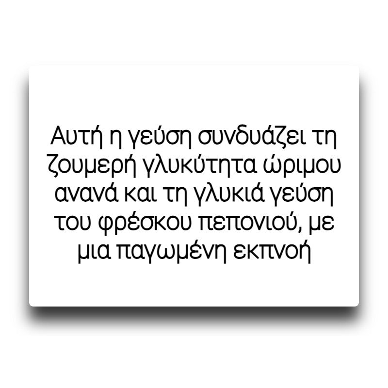 Ένας τροπικός παράδεισος στο μπουκάλι σας. Αυτή η γεύση συνδυάζει τη ζουμερή γλυκύτητα ώριμου ανανά και τη γλυκιά γεύση του φρέσκου πεπονιού, με μια παγωμένη εκπνοή που κάνει κάθε ρουφηξιά μια αναζωογονητική εμπειρία.