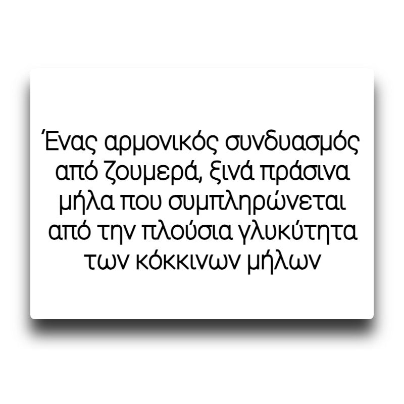 Ένας αρμονικός συνδυασμός από ζουμερά, ξινά πράσινα μήλα που συμπληρώνεται από την πλούσια γλυκύτητα των κόκκινων μήλων. Ένα υγρό ιδανικό για όσους εκτιμούν τις απαλές γεύσεις των φρέσκων, ώριμων μήλων.