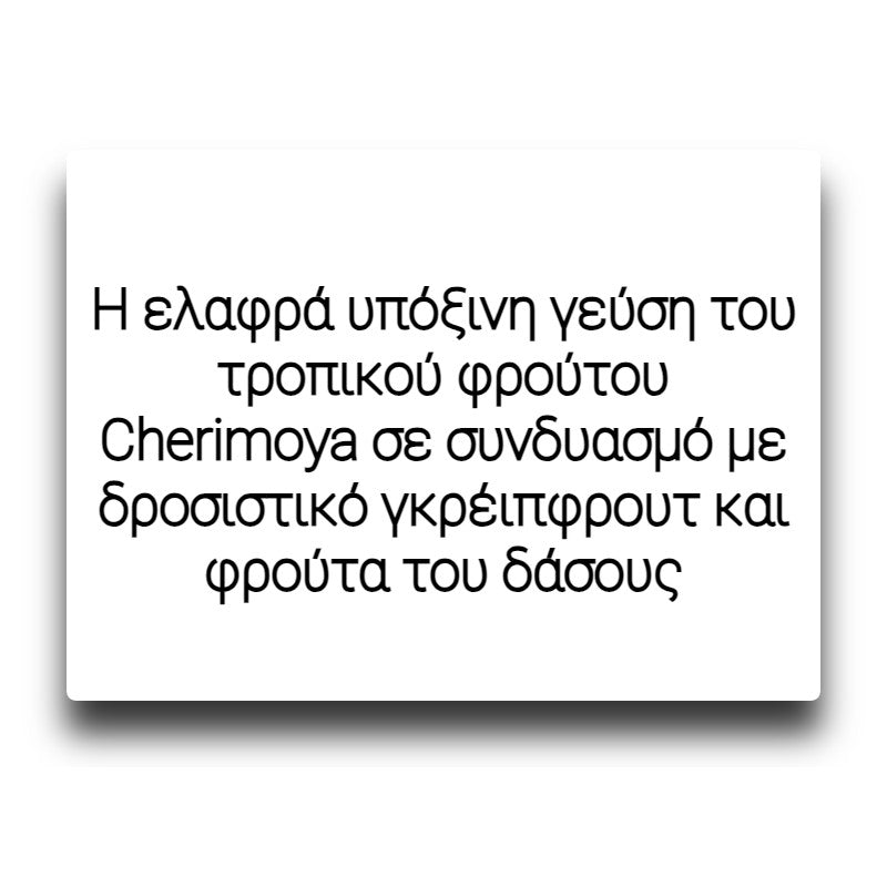 Η ελαφρά υπόξινη γεύση του τροπικού φρούτου Cherimoya, που προέρχεται από το Περού και τους Ίνκα, θεωρείται από τα νοστιμότερα τροπικά φρούτα στον κόσμο. Σε συνδυασμό με δροσιστικό γκρέιπφρουτ και φρούτα του δάσους, σας προσφέρει μια μεθυστική γεύση, ένας εξωτικός συνδυασμός που θα σας συναρπάσει!