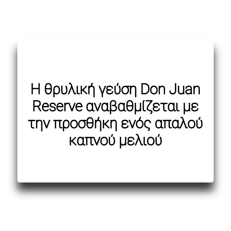 Το Don Juan Tabaco Honey είναι ένα σύνθετο και πλούσιο μείγμα γεύσεων. Η θρυλική γεύση Don Juan Reserve αναβαθμίζεται με την προσθήκη ενός απαλού καπνού μελιού, δημιουργώντας ένα ατμιστικό αποτέλεσμα γεμάτο βάθος και χαρακτήρα. Ιδανικό για όσους αγαπούν τις εκλεπτυσμένες καπνικές νότες, αυτή η σύνθεση αποτελεί ωδή στους premium καπνούς.