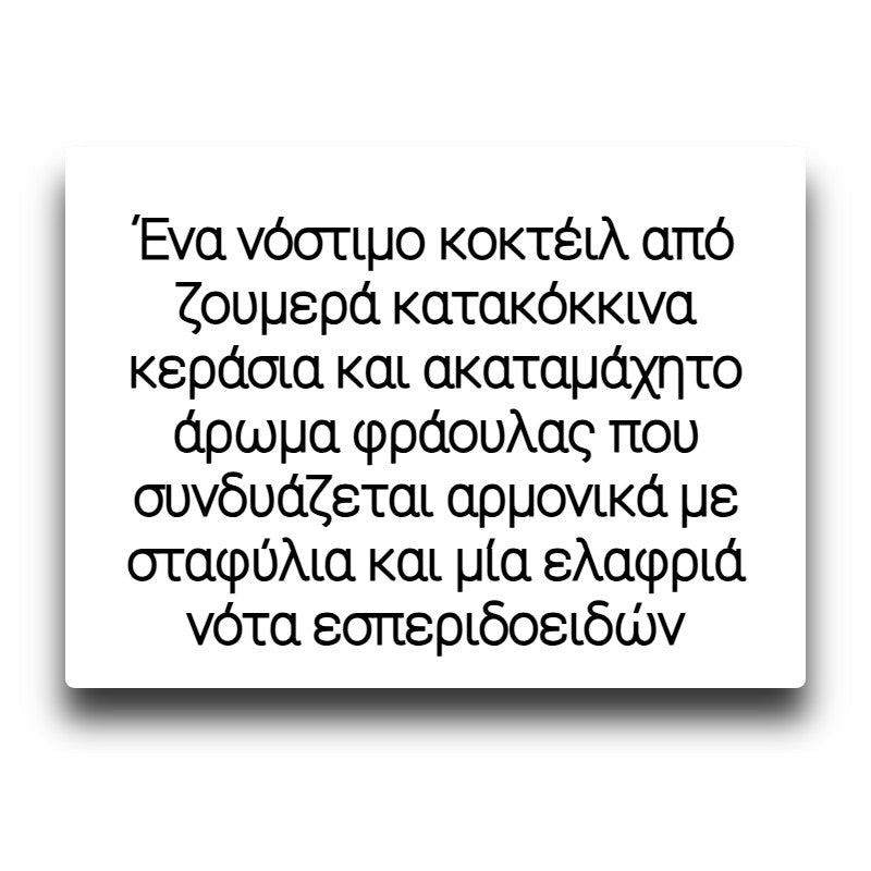 Ένα νόστιμο κοκτέιλ από ζουμερά κατακόκκινα κεράσια και ακαταμάχητο άρωμα φράουλας που συνδυάζεται αρμονικά με σταφύλια και μία ελαφριά νότα εσπεριδοειδών.