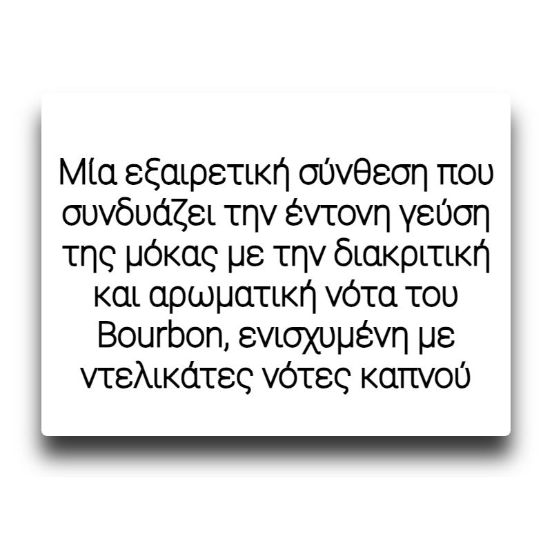 Μία εξαιρετική σύνθεση που συνδυάζει την έντονη γεύση της μόκας με την διακριτική και αρωματική νότα του Bourbon, ενισχυμένη με ντελικάτες νότες καπνού. Οι διαστάσεις του Bourbon και η βελούδινη υφή της μόκας ενώνονται με τον καπνό, δημιουργώντας μια γεμάτη και ισορροπημένη γεύση. Κατάλληλο για όσους αναζητούν μια ξεχωριστή και πολυτελή εμπειρία.