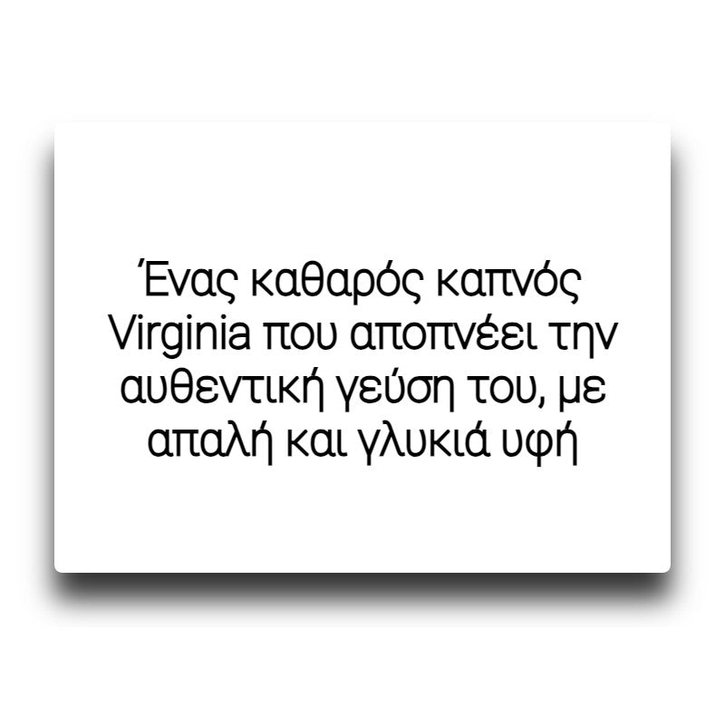 Ένας καθαρός καπνός Virginia που αποπνέει την αυθεντική γεύση του, με απαλή και γλυκιά υφή. Η φυσική γεύση του καπνού Virginia προσφέρει μια ατμιστική εμπειρία που αποτυπώνει την αυθεντικότητα του, ιδανική για όσους εκτιμούν την απλότητα και την ποιότητα χωρίς περιττά στοιχεία.