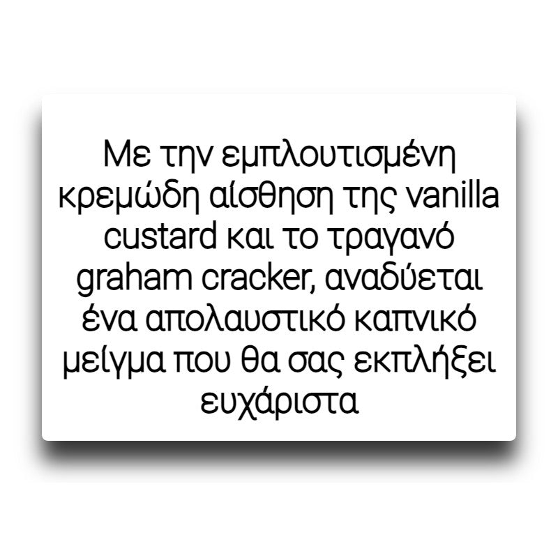 Ένας υψηλής ποιότητας αρωματικός καπνός που θα ικανοποιήσει ακόμη και τους πιο απαιτητικούς ατμιστές. Με την εμπλουτισμένη κρεμώδη αίσθηση της vanilla custard και το τραγανό graham cracker, αναδύεται ένα απολαυστικό καπνικό μείγμα που θα σας εκπλήξει ευχάριστα!