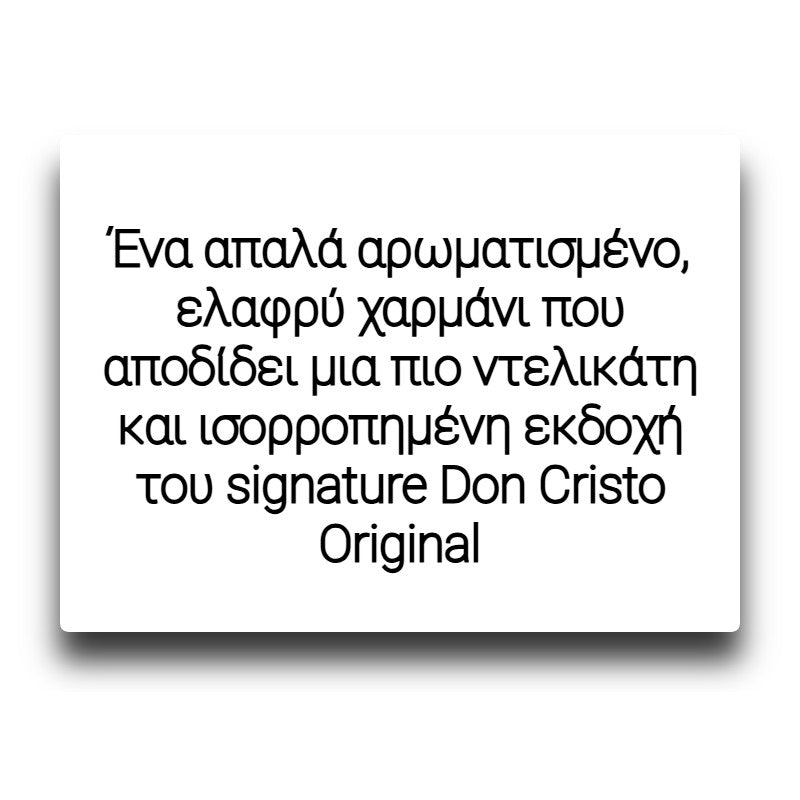 Εκλεπτυσμένη και κομψή. Ένα απαλά αρωματισμένο, ελαφρύ χαρμάνι που αποδίδει μια πιο ντελικάτη και ισορροπημένη εκδοχή του signature Don Cristo Original.