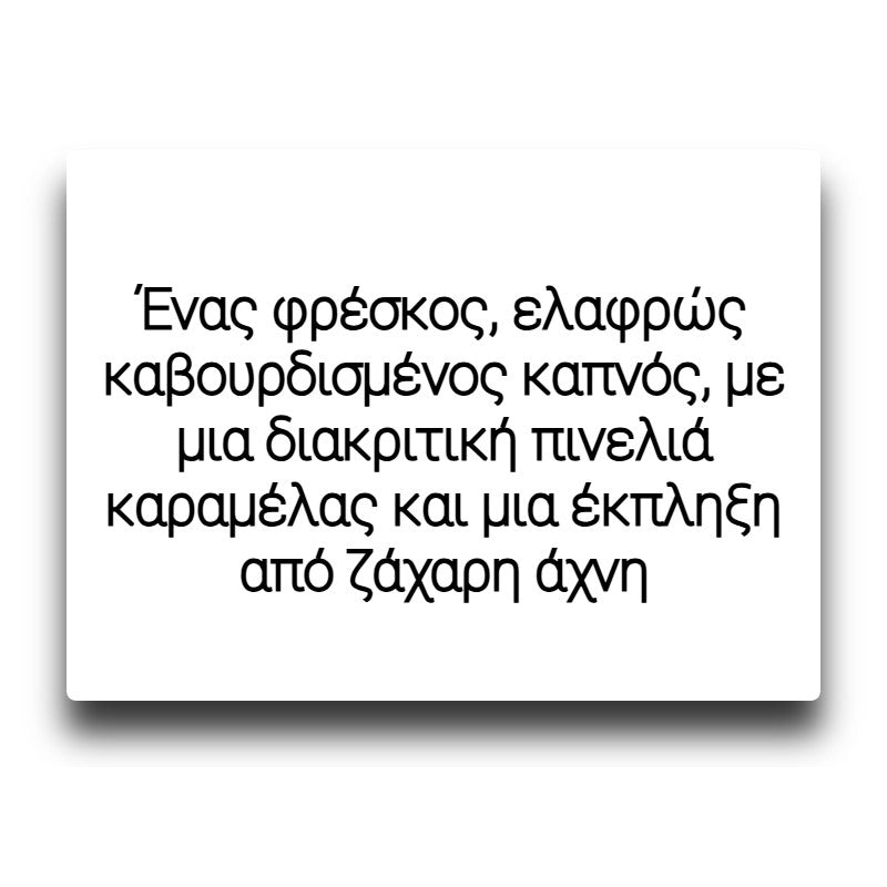 Ένας φρέσκος, ελαφρώς καβουρδισμένος καπνός, με μια διακριτική πινελιά καραμέλας και μια έκπληξη από ζάχαρη άχνη.