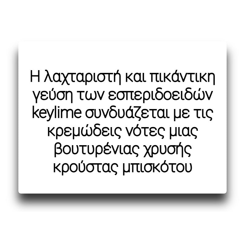 Το κλειδί της γεύσης είναι το λάιμ! Η λαχταριστή και πικάντικη γεύση των εσπεριδοειδών keylime συνδυάζεται με τις κρεμώδεις νότες μιας βουτυρένιας χρυσής κρούστας μπισκότου. Ο ισορροπημένος συνδυασμός του γλυκού crumble και της πικρής γεύσης του keylime θα σας κάνει να θέλετε πάντα να φάτε πρώτα το επιδόρπιο. Made in USA!