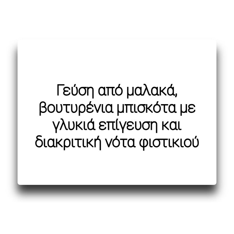 Γεύση από μαλακά, βουτυρένια μπισκότα με γλυκιά επίγευση και διακριτική νότα φιστικιού. Απαλό και νόστιμο σαν τα φρεσκοψημένα γλυκίσματα.