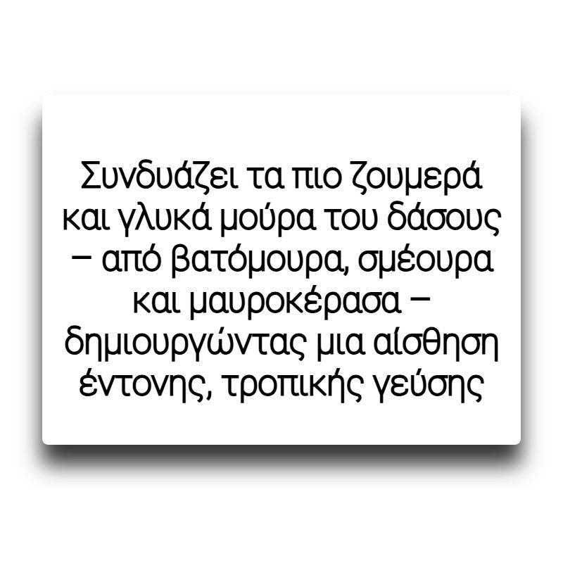 Ένα υπέροχο, φρουτώδες μείγμα που συνδυάζει τα πιο ζουμερά και γλυκά μούρα του δάσους – από βατόμουρα, σμέουρα και μαυροκέρασα – δημιουργώντας μια αίσθηση έντονης, τροπικής γεύσης. Η πλούσια γλυκύτητα των μούρων ενώνεται με μια απαλή, φρουτώδη “γαλαξιακή” υφή και μια γλυκιά φρουτώδη έγχυση. Ένα άρωμα που ταξιδεύει τις αισθήσεις σε νέους κόσμους, γεμάτο γλυκιά ένταση και δροσιά.
