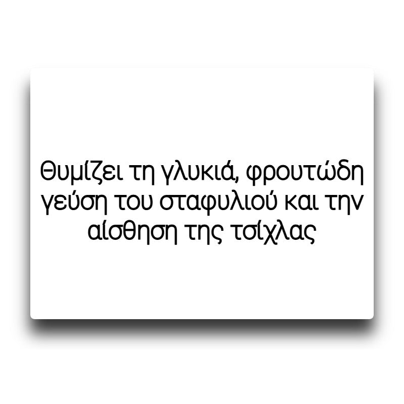 Ένα απολαυστικό και παιχνιδιάρικο άρωμα που θυμίζει τη γλυκιά, φρουτώδη γεύση του σταφυλιού και την αίσθηση της τσίχλας. Η έντονη γεύση ώριμου σταφυλιού συνδυάζεται με την αφράτη, γλυκιά αίσθηση τσίχλας, δημιουργώντας έναν αέρα φρεσκάδας και γλυκύτητας. Μια γεύση γεμάτη ζωντάνια που αναζωογονεί και φέρνει τη διάθεση για παιχνίδι.