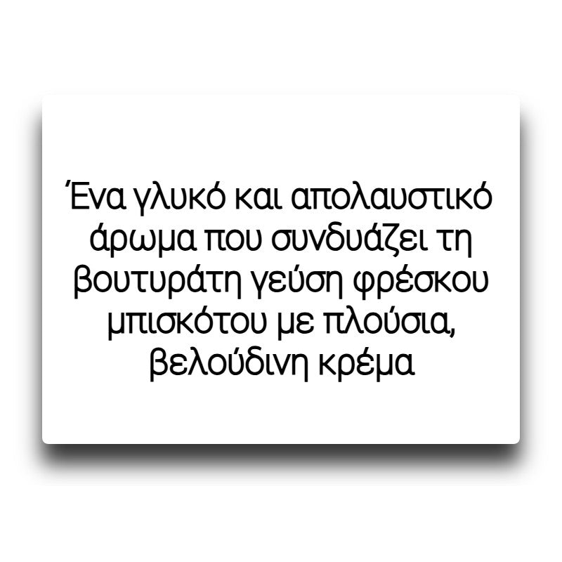 Ένα γλυκό και απολαυστικό άρωμα που συνδυάζει τη βουτυράτη γεύση φρέσκου μπισκότου με πλούσια, βελούδινη κρέμα. Κάθε εισπνοή φέρνει νότες τραγανού μπισκότου που λιώνουν στη γλώσσα, ενώ η κρεμώδης επίγευση χαρίζει μια αίσθηση απόλυτης ικανοποίησης. Το ιδανικό άρωμα για τους λάτρεις των γλυκών γεύσεων που αναζητούν καθημερινή πολυτέλεια.