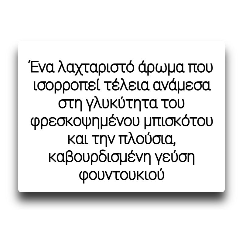 Ένα λαχταριστό άρωμα που ισορροπεί τέλεια ανάμεσα στη γλυκύτητα του φρεσκοψημένου μπισκότου και την πλούσια, καβουρδισμένη γεύση φουντουκιού. Με κάθε εισπνοή, νιώθεις την τραγανή υφή του μπισκότου να αγκαλιάζει τη γεμάτη, ξηροκαρπική νοστιμιά, ενώ η απαλή επίγευση αφήνει μια διακριτική αίσθηση ζεστασιάς. Ένα απολαυστικό μείγμα που θυμίζει στιγμές άνεσης και απόλαυσης.