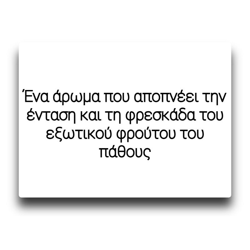 Ένα άρωμα που αποπνέει την ένταση και τη φρεσκάδα του εξωτικού φρούτου του πάθους. Με κάθε εισπνοή, οι γλυκές και ελαφρώς ξυνούτσικες νότες του passionfruit ξεδιπλώνονται, δημιουργώντας μια ζωντανή, τροπική αίσθηση που αναζωογονεί τις αισθήσεις. Η φυσική γλύκα του φρούτου ισορροπεί άψογα με την όξινη πινελιά, κάνοντάς το ιδανική επιλογή για όσους θέλουν μια τολμηρή, φρουτώδη εμπειρία γεμάτη ενέργεια και καλοκαιρινή διάθεση.