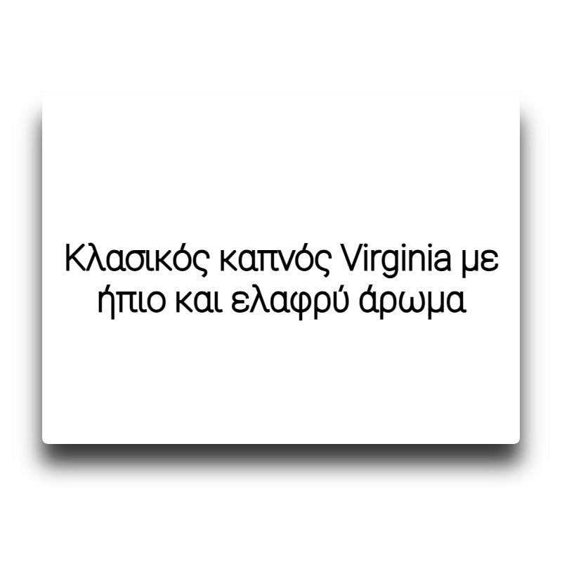 Κλασικός καπνός Virginia με ήπιο και ελαφρύ άρωμα. Η βελούδινη γεύση του αποδίδει μια εμπειρία που προσομοιάζει στον καπνό τσιγάρου, κατάλληλο για όσους πρόκειται να κάνουν τη μετάβαση από το τσιγάρο στο άτμισμα.