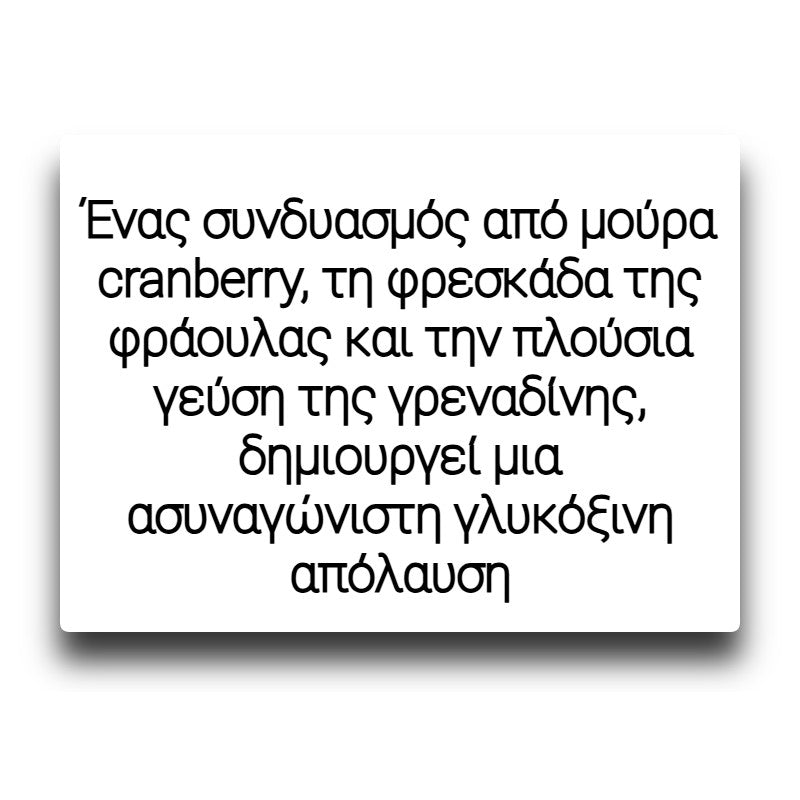 Ένας σαγηνευτικός συνδυασμός από μούρα cranberry, τη φρεσκάδα της φράουλας και την πλούσια γεύση της γρεναδίνης, δημιουργεί μια ασυναγώνιστη γλυκόξινη απόλαυση.