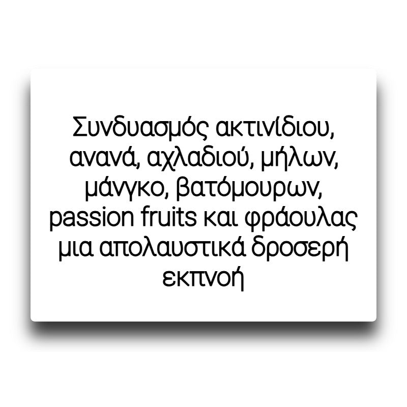 Μια φρουτένια πανδαισία! Ένας εξαιρετικός συνδυασμός ακτινίδιου, ανανά, αχλαδιού, μήλων, μάνγκο, βατόμουρων, passion fruits και φράουλας, ο οποίος αποδίδει μια ρεαλιστική φρουτώδη αίσθηση κατά την εισπνοή και μια απολαυστικά δροσερή εκπνοή. Η αρμονική ισορροπία τόσων πολλών φρούτων σε μία σύνθεση, δημιούργησε μια αισθησιακή γευστική εμπειρία που έκανε αυτό το υγρό να αγαπηθεί και να είναι το πρώτο σε προτίμηση στα καταστήματα, για τέσσερα συνεχόμενα έτη.