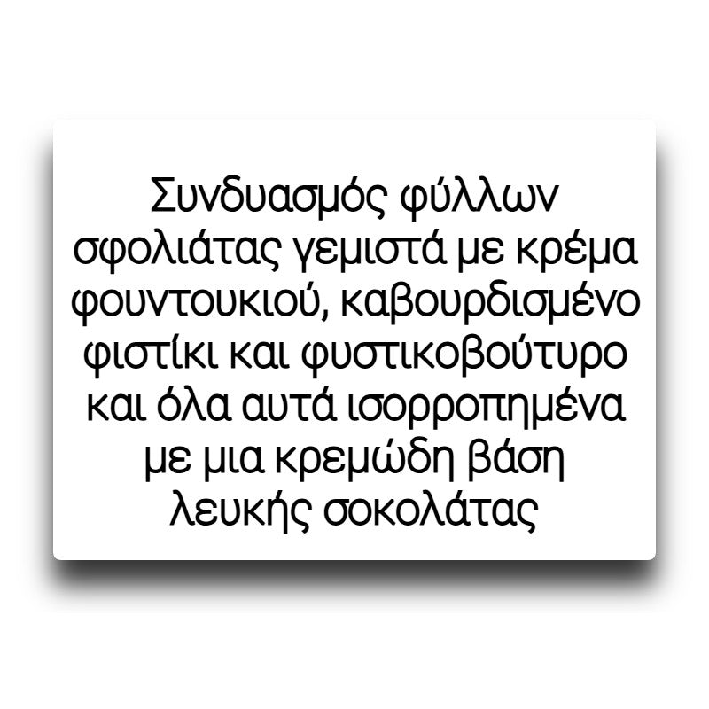 Μια γλυκιά συνταγή εμπνευσμένη από ανατολίτικα αρώματα . Ένας συνδυασμός φύλλων σφολιάτας γεμιστά με κρέμα φουντουκιού, καβουρδισμένο φιστίκι και φυστικοβούτυρο και όλα αυτά ισορροπημένα με μια κρεμώδη βάση λευκής σοκολάτας. Ένα μοναδικό προφίλ που όμοιο του δεν έχει υπάρξει ποτέ ξανά.