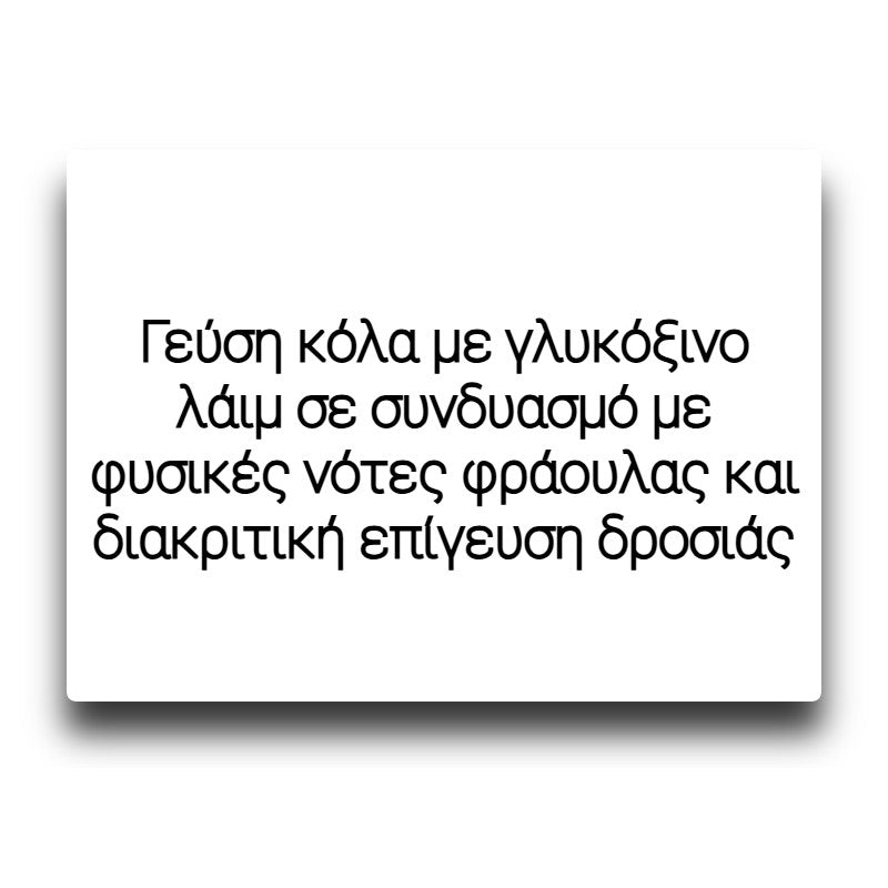 Ένας εθιστικός συνδυασμός. Γεύση κόλα με γλυκόξινο λάιμ σε συνδυασμό με φυσικές νότες φράουλας και διακριτική επίγευση δροσιάς. Ένα εκπληκτικό αποτέλεσμα για καθημερινή απόλαυση.