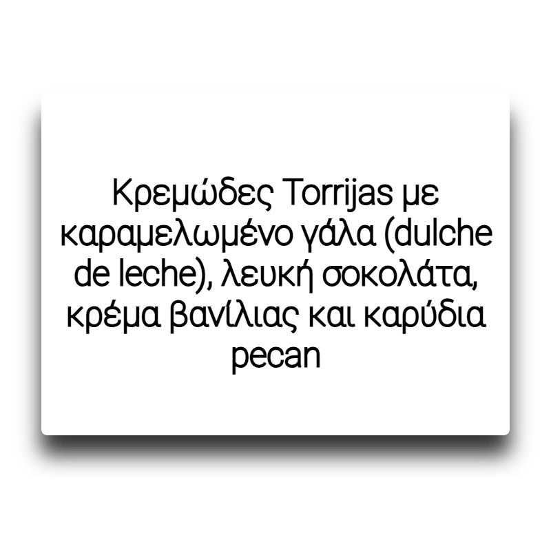 Κρεμώδες Torrijas (δημοφιλές Ισπανικό γλυκό) σαν βάση, συνδυάζονται με καραμελωμένο γάλα (dulche de leche) και λευκή σοκολάτα, κρέμα βανίλιας και καρύδια pecan, θα οδηγήσουν την ατμιστική σας εμπειρία στο επόμενο επίπεδο.