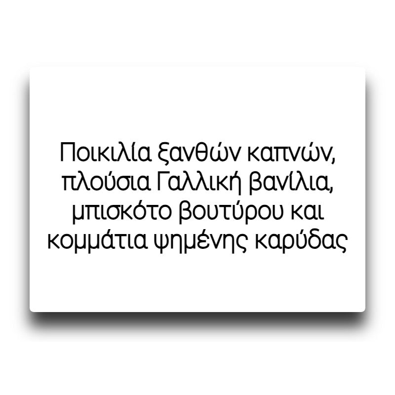 Ποικιλία ξανθών καπνών, πλούσια Γαλλική βανίλια, μπισκότο βουτύρου και κομμάτια ψημένης καρύδας. Ήπιες νότες καπνού που δένουν αρμονικά με την βουτυρένια επίγευση από φρεσκοψημένο μπισκότο σε συνδυασμό με την κυρίαρχη γεύση της Γαλλικής βανίλιας και με ένα τελείωμα από νότες ψημένης καρύδας. Ένα προφίλ απολαυστικό, γεμάτο εντάσεις πού θα σάς ταξιδέψει με κάθε του εισπνοή!